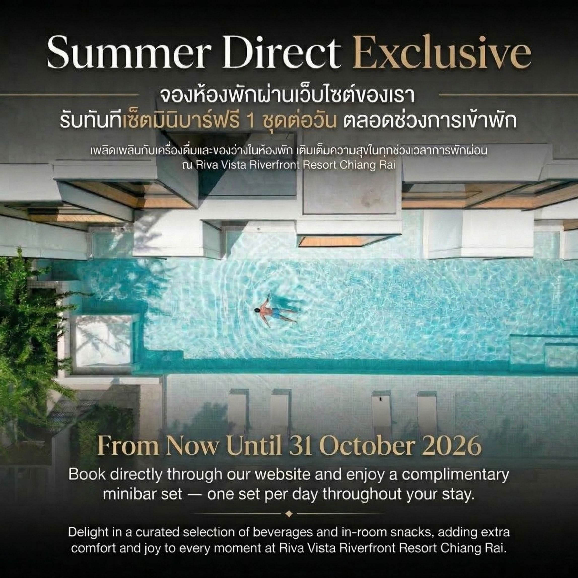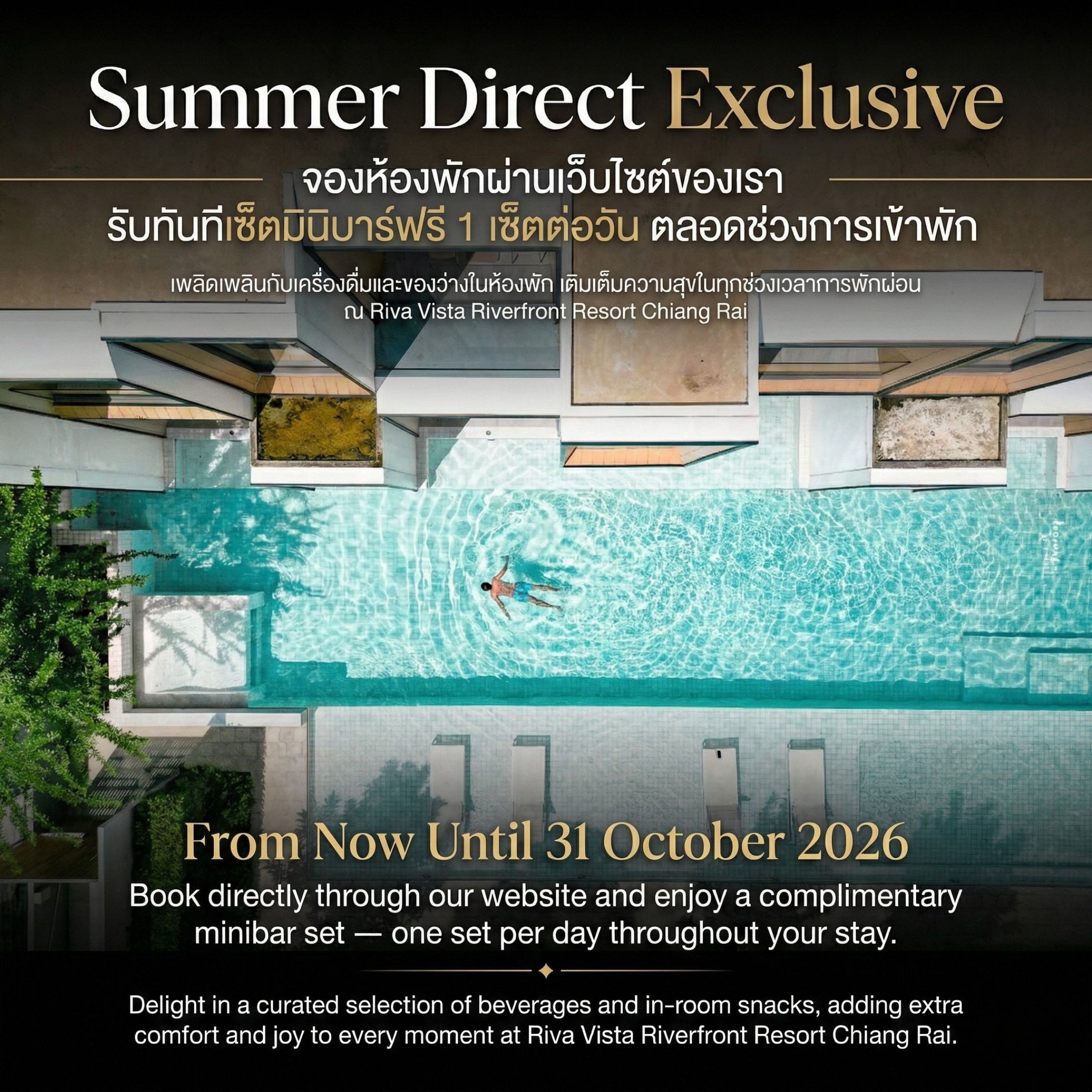 "RIVA VISTA RIVERFRONT RESORT CHIANG RAI" offers 61 rooms across 9 room types, step into our tranquil sanctuary where modern design seamlessly blends with natural surroundings. Experience the unparalleled beauty of Chiang Rai's green season here at RIVA VISTA. Choose us as your destination and immerse yourself in a serene yet vibrant environment."